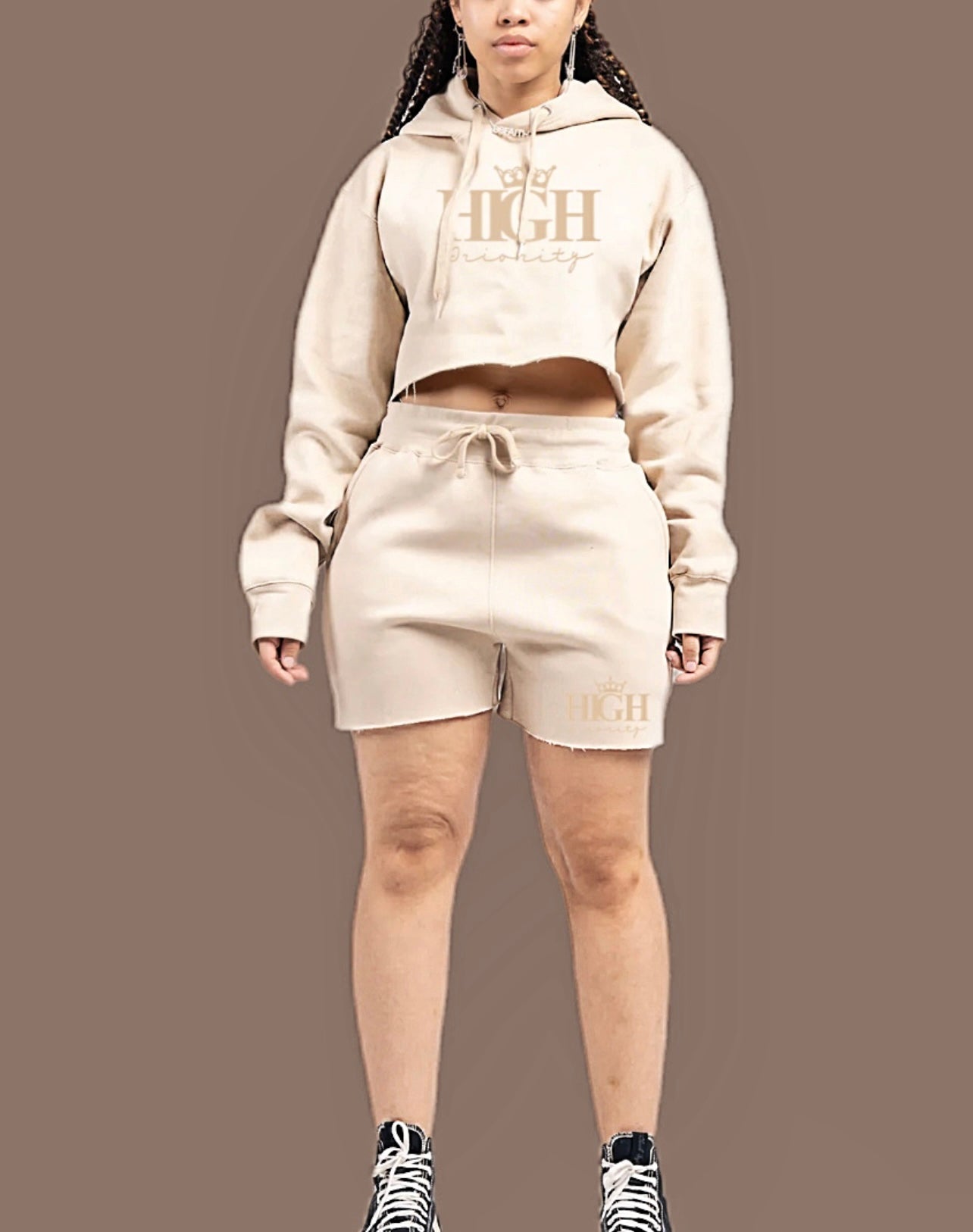 Indulge in comfort with our Riley High Priority hooded crop top fleece shorts set. Introducing our sand set paired with a tan logo. Designed for coziness, the soft feel and plush fabric create a luxurious experience. The durability ensures it withstands daily wear.